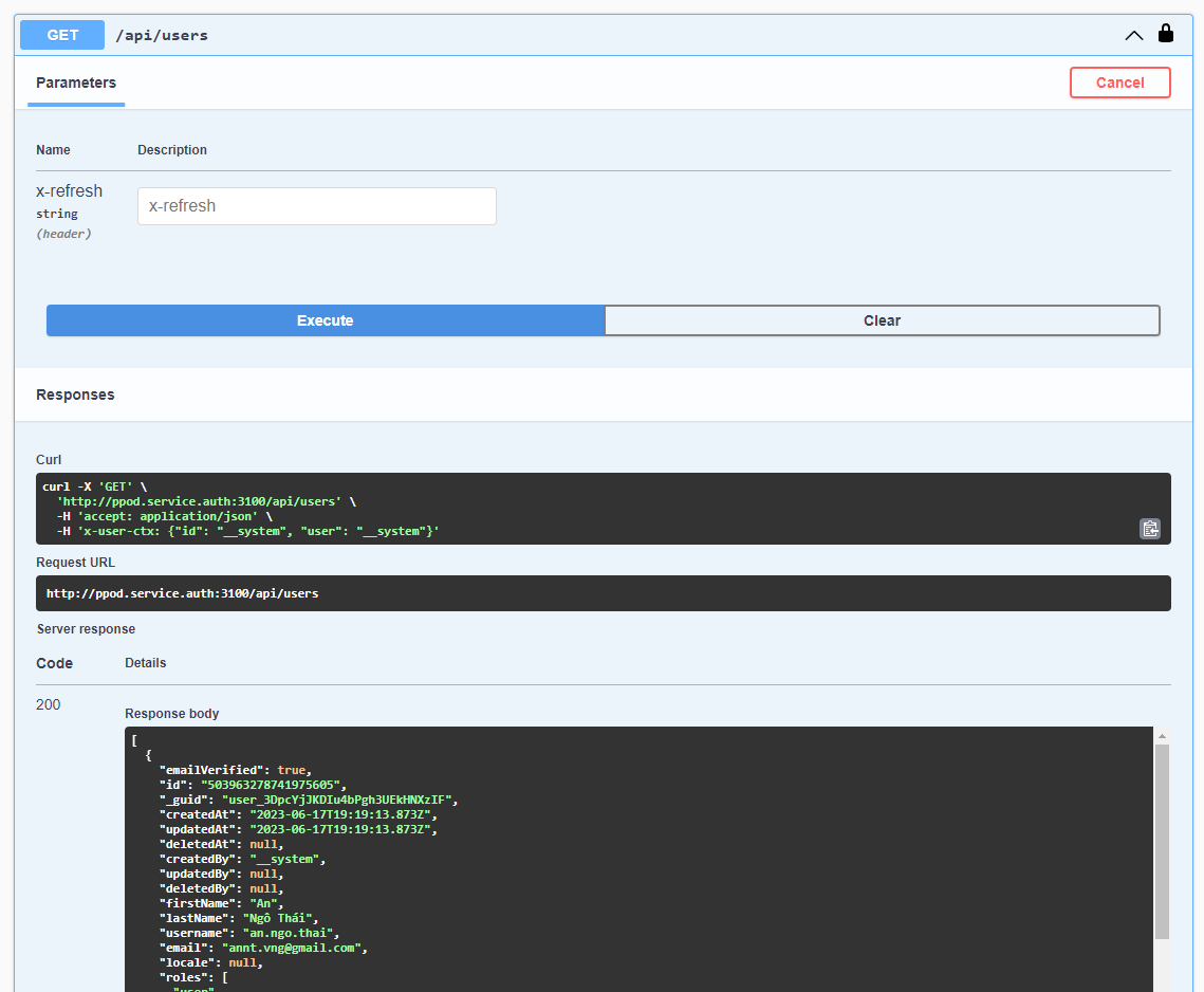 - Call any method with above userContext in header 'x-user-ctx'