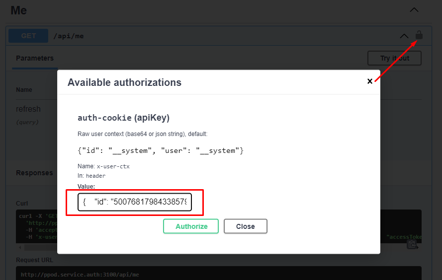 From Swagger ui, click Authorize button and enter into input